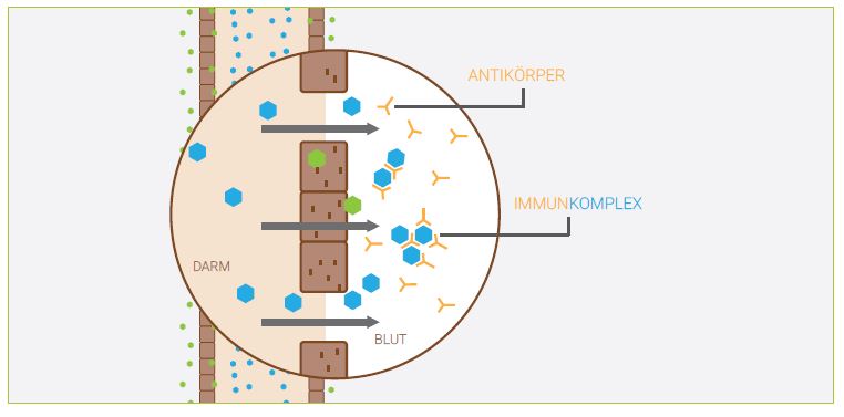Das immunologische Abwehrsystem eines gesunden Darms erkennt körperfremde Strukturen, wie Krankheitserreger, stuft diese als gefährlich ein und weist sie zurück. Alle Nahrungsmittelbestandteile werden ebenfalls durch das Immunsystem im Darm „kontrolliert“, als körperfremd erkannt, aber als ungefährlich eingestuft und durch die Darmbarriere ins Blut geschleust.