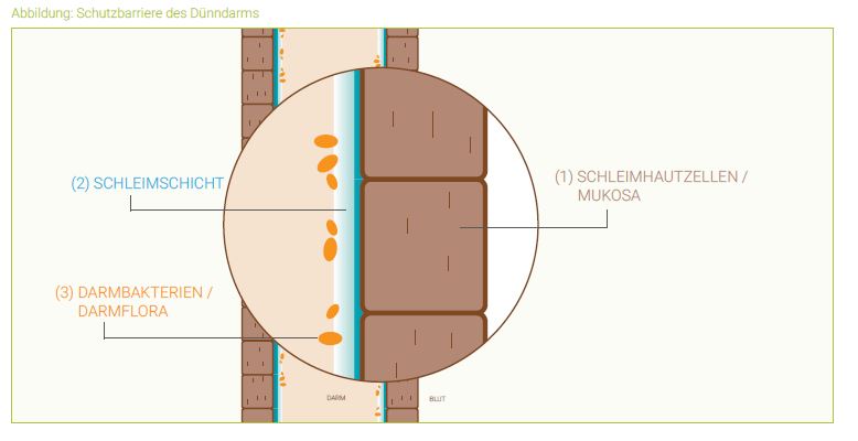 Die 3-teilige Schutzbarriere des Darms wird aus den Schleimhautzellen, die eng miteinander verbunden sind, der Schleimschicht, oberhalb der Schleimhautzellen und den typischen Darmbakterien (z. B. Laktobakterien, Bifido-Bakterien), die die Schleimschicht besiedeln, gebildet.